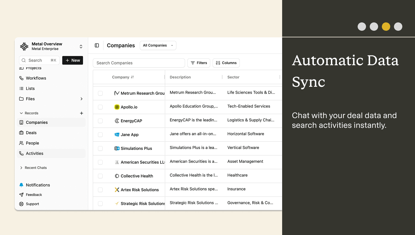 Companies: Company records flow into Metal's "Companies" library, enriched with additional context from your firm's documents and external data sources.