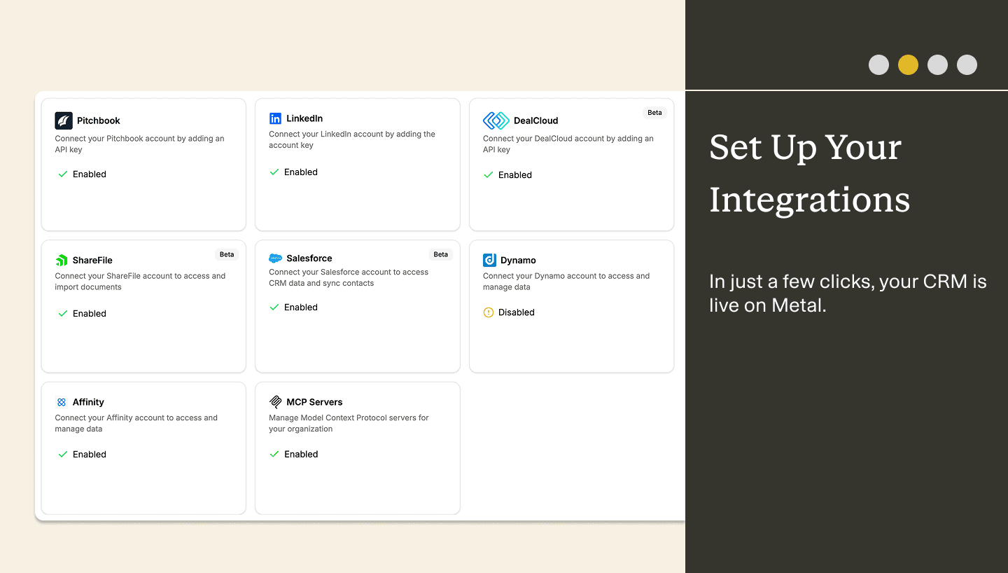 If your firm uses Salesforce, Affinity, or DealCloud, connecting to Metal takes minutes. Once integrated, your deal activity data becomes part of a living intelligence system that grows more valuable with every interaction.