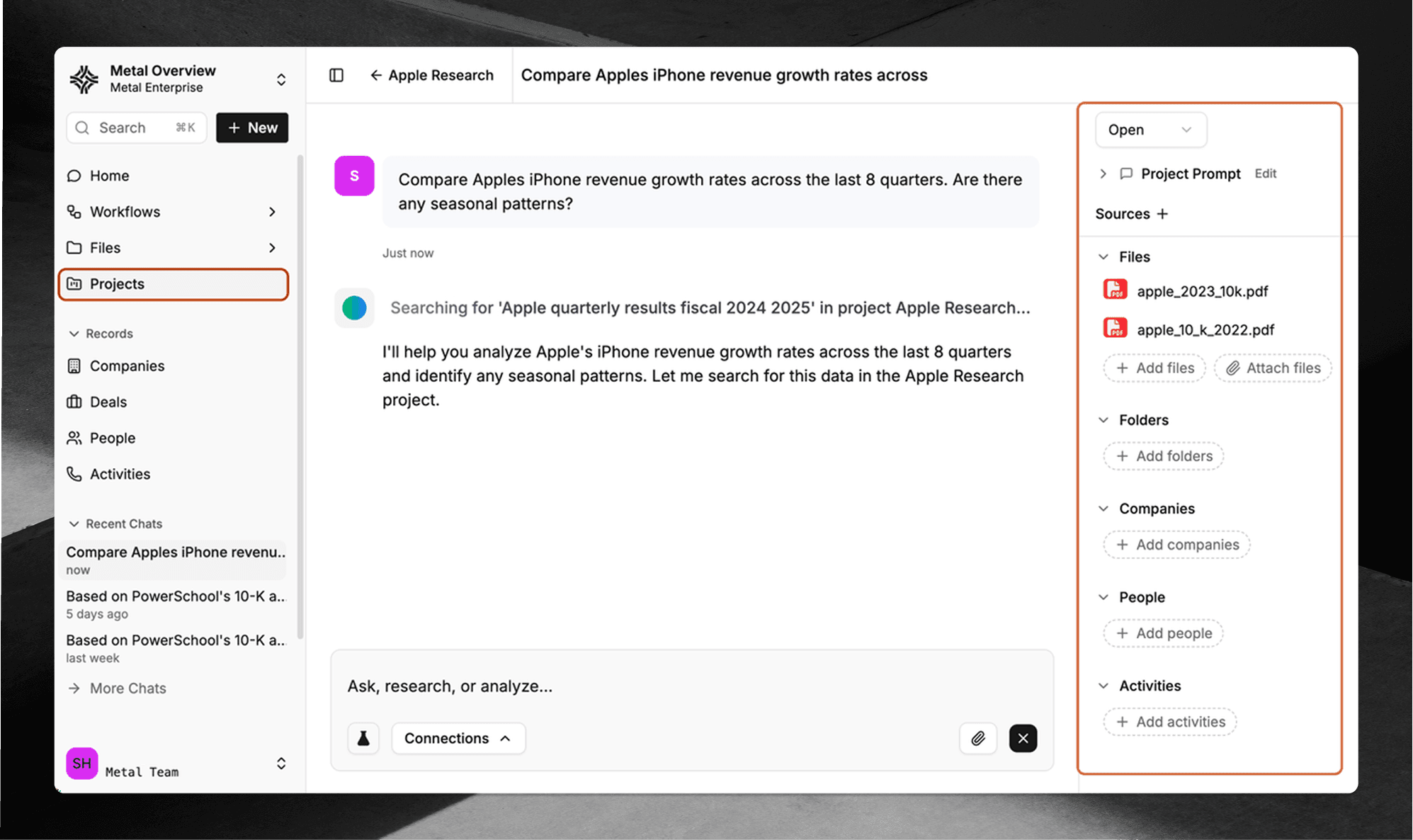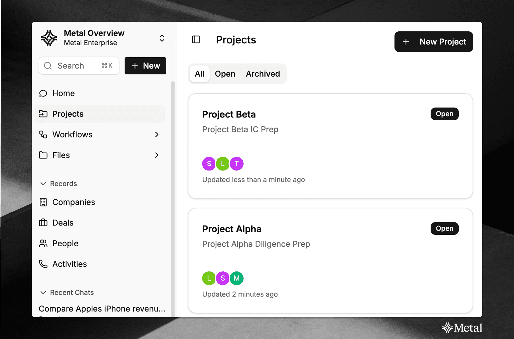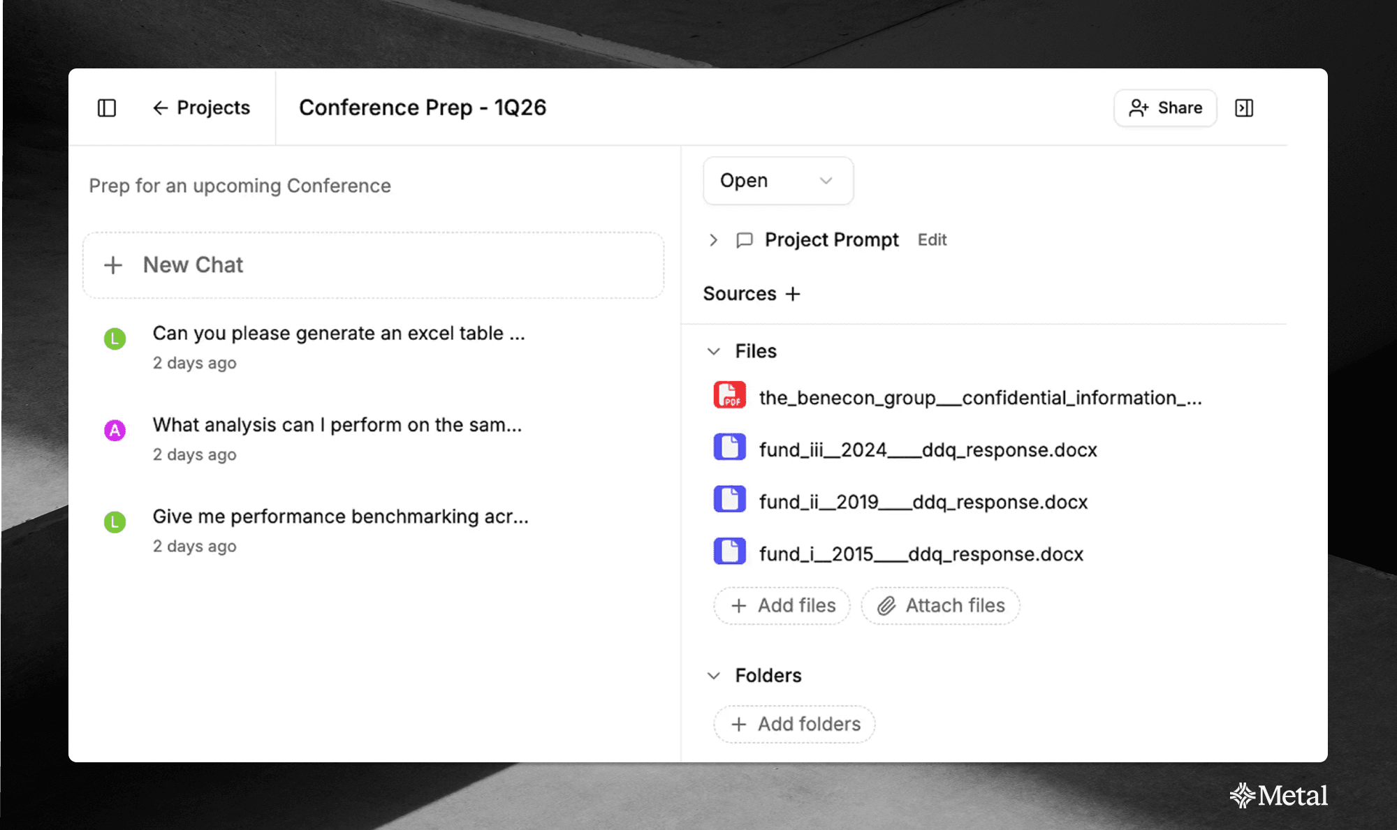 Metal Projects create dedicated collaborative spaces for each deal, target company, or conference prep. Instead of treating AI as a disconnected Q&A tool, Projects become the central workspace where your team's diligence actually happens.
